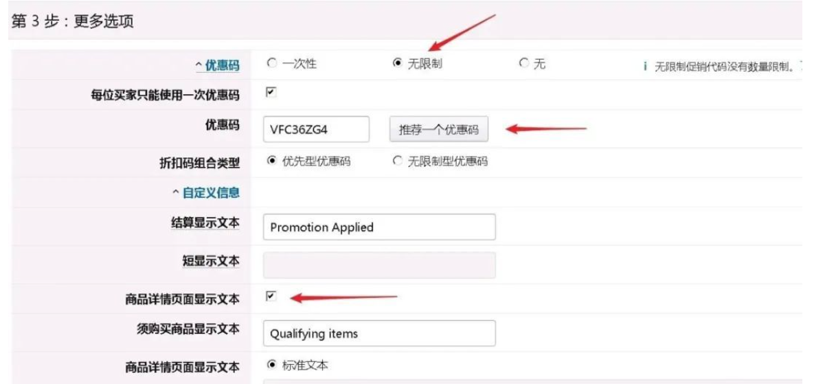 第二种,无限制促销码,这种优惠码一般都是使用在站外,同时系统也会推荐一个促销码,这里也是一样可以根据情况看是否需要点击【每位买家只能使用一次优惠码】;