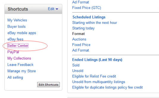 ③ 从eBay页面左侧Shortcuts-Seller Center进入。