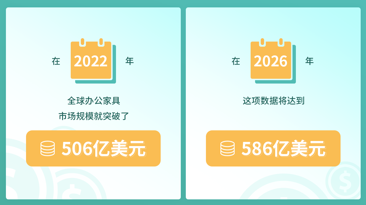 近两年,办公家具消费有所下滑,行业的红利看似已经过去,很多家具企业反馈市场不行,利润被疯狂稀释,苟延残喘。但放眼全球来看,办公家具生产的需求其实被按下了“加速键”。根据Statista数据显示,去年全球的办公家具市场规模就达到了506亿美元,预计在未来的4年里将以5.01%的年复合增长率增长,到2026年将达到586亿美元。