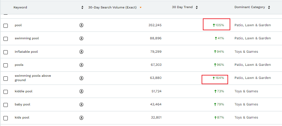 每到夏季,泳池的搜索热度都会上涨。Google Trends数据显示,“swimming pool”这一关键词已经开始进入攀爬期,“summer waves pool”的搜索量更是飙升1700%。在亚马逊美国站上,主关键词“inflatable pool”近一个月的搜索量为79299个,且热度仍在增加,相关搜索词涨幅高达164%。