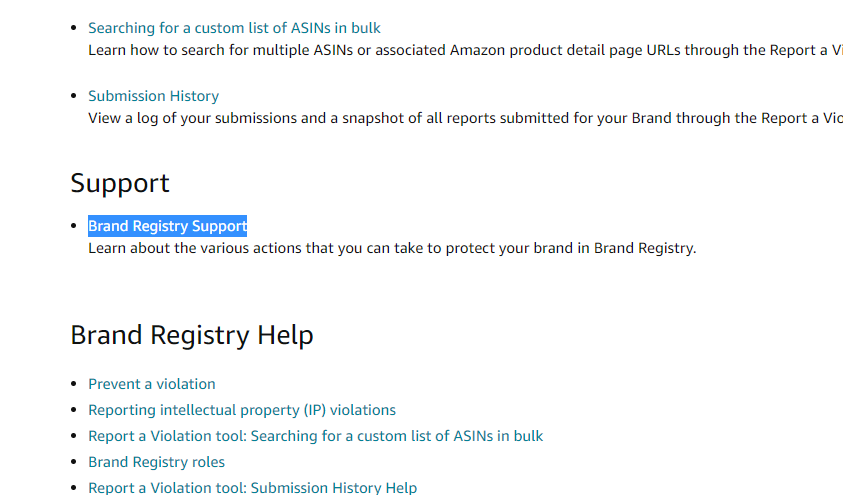 第三步:这时候我们需要把页面往下拉,看到Support为标题的一段,点击Brand Registry Support。