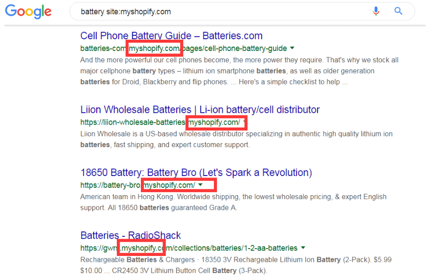 首先,我们在搜索栏中输入:卖家销售的产品关键词+site:myshopify.com,打个比方,你正在销售一款电池,那么你就可以在搜索栏里输入:“Battery site:myshopify.com”,这样就可以找到销售电池的shopify卖家的店铺了。