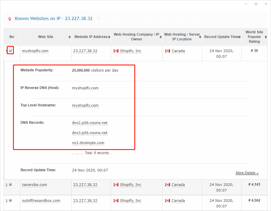 当我们进入myip.ms的网站,在我们输入Shopify的IP之后点击“Whois Lookup”的按钮,再点击“Other Sites on IP”就可以找到所有的托管在这个服务器上的Shopify的店铺。当我们想要知道这些Shopify店铺的排名,我们还可以依次点击“View All Records”和“World Site Popular Rating”的按钮,就可以在这个页面找到最受消费者欢迎的店铺。因为Shopify上的服务器是在加拿大,所以我们可以用的几个IP地址有以下这4个: