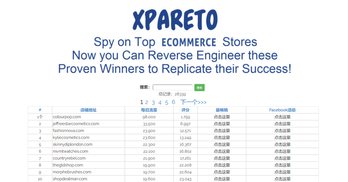 xpareto使用起来比较方便,最大的好处就是不需要注册,也不需要付费,根据关键词一键点击即可查找Shopify店铺,除了卖家的页面,我们还能从xpareto查询到网站的每日流量,best selling,以及facebook campaigns。不过这里需要特别要说明的是,这个平台上所展示的网站,都是做dropshipping的商家。