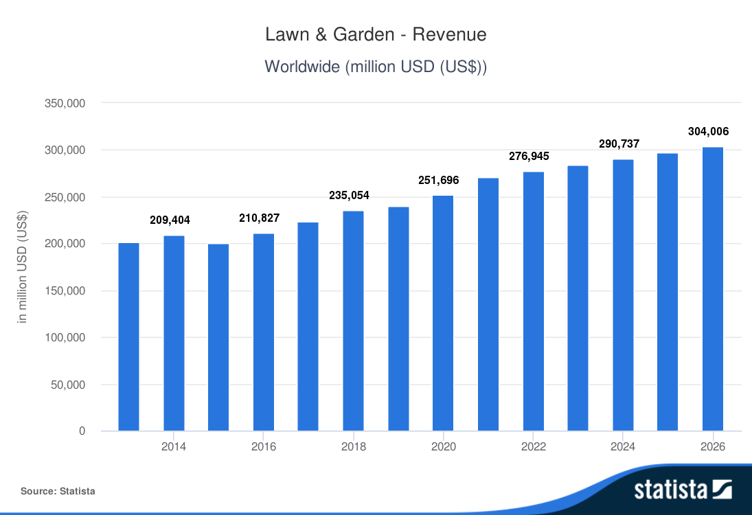 在草坪和花园领域,重点在于家居/花园装饰产品的市场调研,包括园艺工具和园艺设备如雨伞、遮阳篷也是花园装饰的一部分。去年11月份Statista就该领域的市场发展情况进行了预判:到2022年全球草坪和花园市值将达到2769.45亿美元。2022-2026年的复合年增长率将以2.36%的速度增长,预计2026年达到3040.06亿美元。