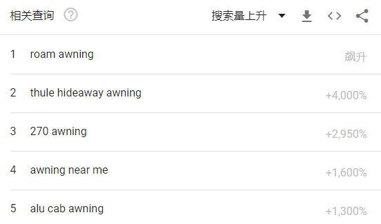 由于雨篷还具备阻挡风雪天气带来伤害的功能,在冬季也拥有一小波热卖市场。在近期的调研中发现,有关雨篷产品的关键词搜索量均成倍数增长,以“thule hideaway awning”关键词为例,近一个月内的搜索量飙升了4000%。
