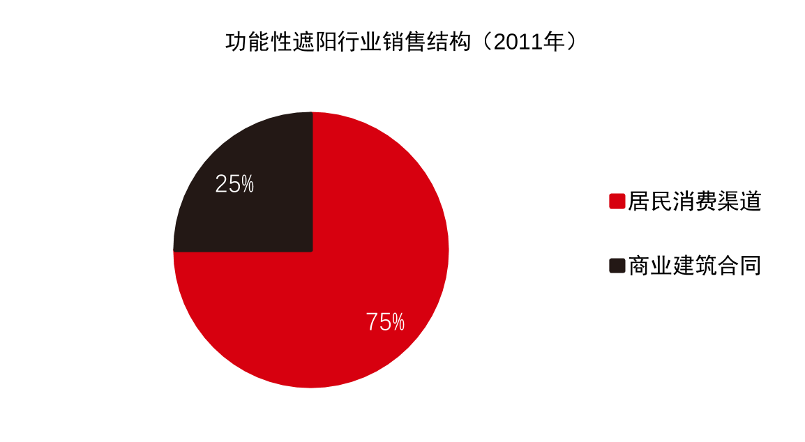 D&R International指出:美国2011年遮阳用品的销售结构中,75%的份额为居民消费,25%为商业建筑合同。如今,功能性雨篷已逐步满足不同层次的需求,住宅居民仍然成为主要的消费渠道。伴随户外餐馆、咖啡厅、泳池等场所数量的增加,雨篷的需求范围也会逐步扩大。