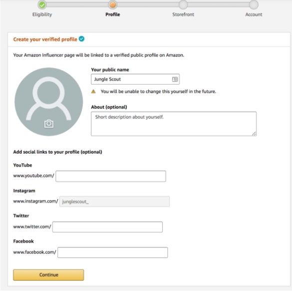 步骤3:提供属于自己的主流社交媒体平台,谨记一定要选择粉丝数量较多的账号,同时需要提供粉丝数量、发帖数量,这是亚马逊需要申请者提供的,用于审核评估;审核通过后,设置Profile名称,简介以及其他的社交媒体账号链接;