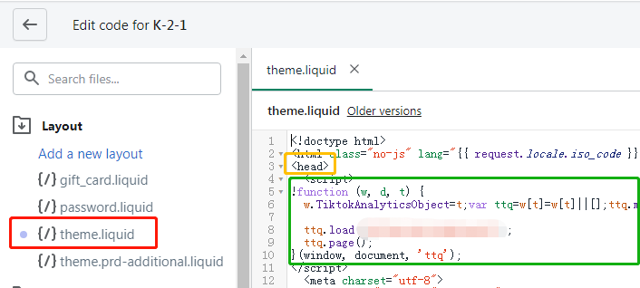 登录Shopify账户,进入网站管理界面 → 点击“在线商店”中的“主题” → 找到当前使用的主题,点击“操作”,选择“编辑代码”。在代码编辑页面中,找到“layout”文件夹下的“theme.liquid”文件,这是网站页面布局的基础文件。在“theme.liquid”文件中,找到第一个标签<head>,将复制的像素代码粘贴在该标签下方,也就是绿色框内,如下图:
