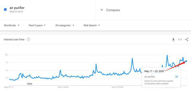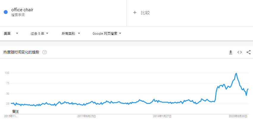 比如办公椅(Office Chair)这一品类热度在一般情况下都趋于平稳,不分季节,今年在疫情的突袭下,居家办公的人多了,所以这一关键词热度上涨的很明显: