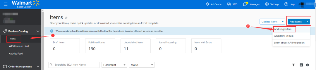 打开沃尔玛卖家中心【Seller Center】,在左侧菜单栏中找到【Product Catalog】,下拉选择 【Items】,页面右侧会显示“Add Items”的页面,点击其中的【Add single item】,进入单体商品上架页面。