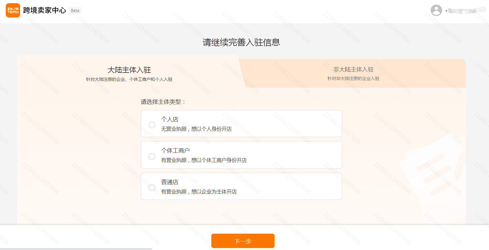 在账号注册网址中输入手机号、密码及验证码后,点击“注册”按钮,请确保所填写的信息真实有效,以便后续审核和联系。进入页面后完善入驻主体信息,目前支持大陆个人店、大陆个体工商户、大陆企业、香港企业。