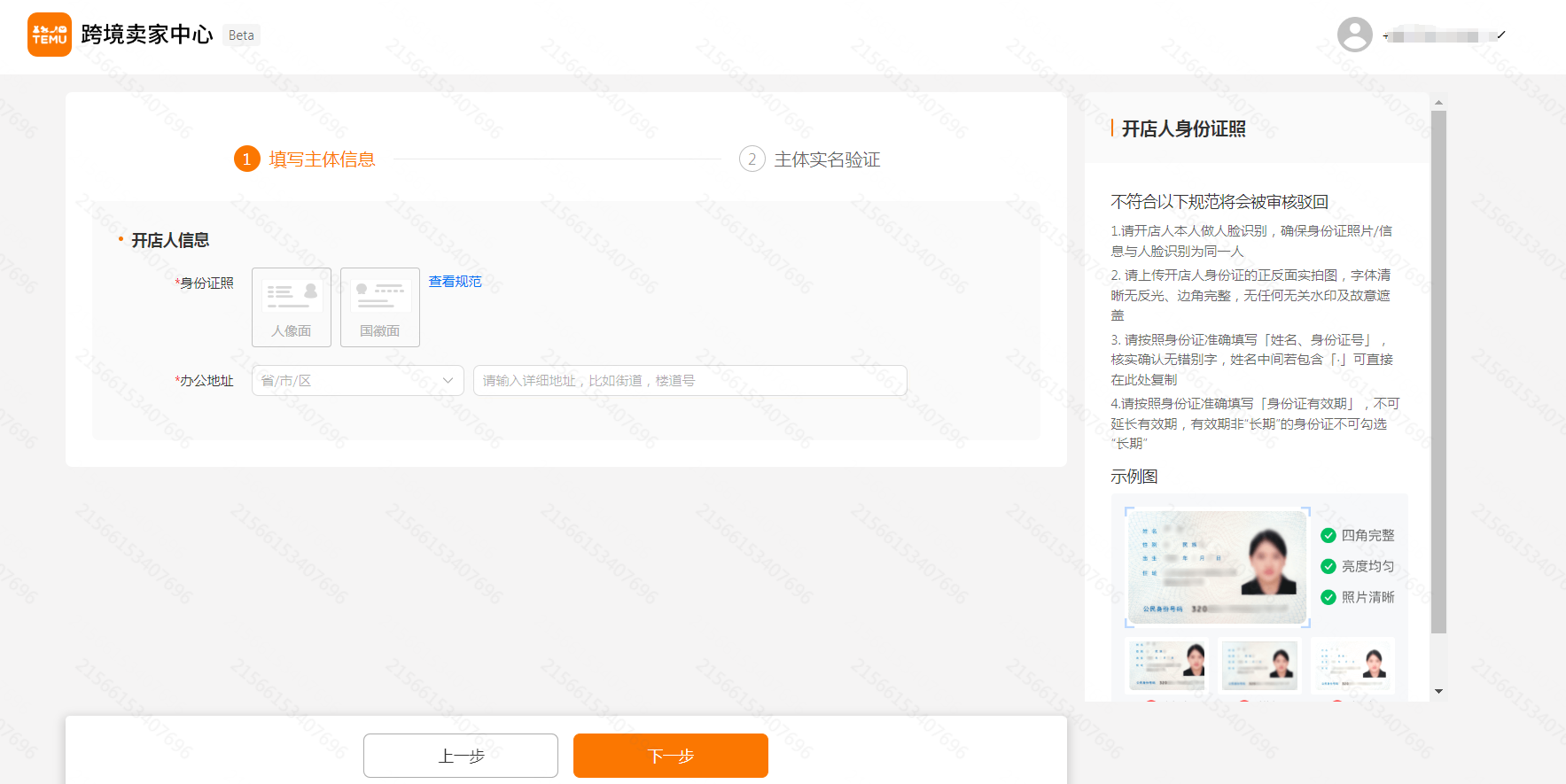 1. 确保您所上传法定代表人身份证上的姓名与营业执照上的法定代表人姓名一致;