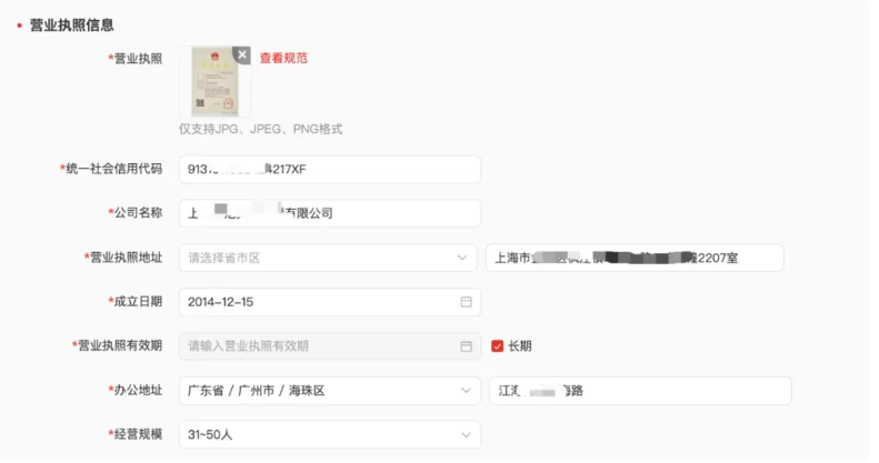 3. 请确保营业执照图片中的公司名称、统一社会信用代码、法定代表人与您填写的对应字段信息完全一致;
