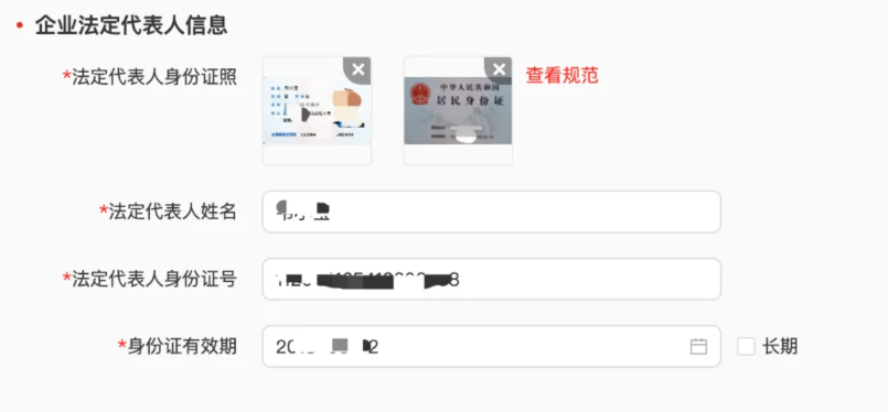 上传企业法定代表人的身份证正反面并填写法定代表人的姓名、身份证及证件期限。