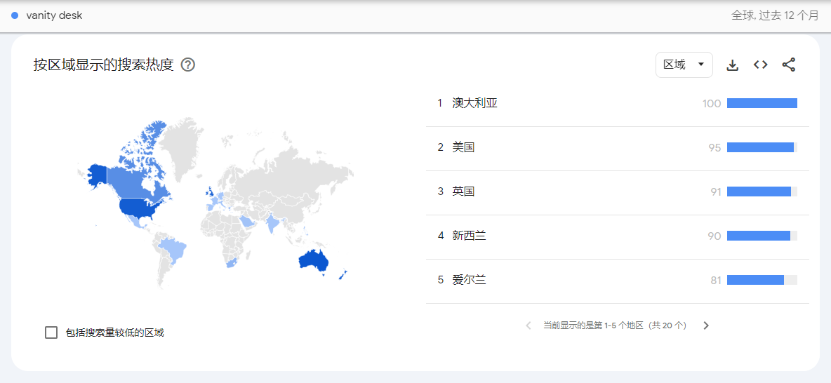 数据显示,在过去的一年里,澳大利亚对梳妆桌的搜索热度赶超美国成为TOP1,其次是热度为95%的美国,英国和新西兰相差不大,爱尔兰排在第五。