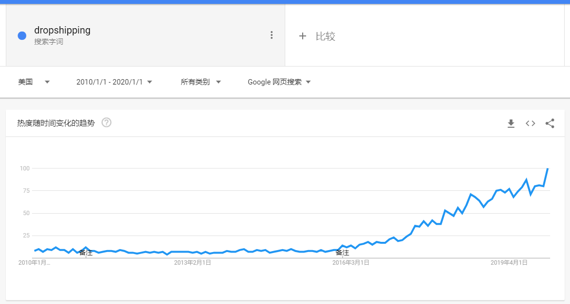 下图是Drop shipping在近十年来的发展趋势,尤其在这近五年的时间里其搜索量实现猛增,该模式才算真正得以广泛推广。而这也意味着越来越多的卖家对Drop shipping模式产生了高度的认可,按照这样的态势发展,未来的Drop shipping将成为影响卖家营销的一个重要模式。
